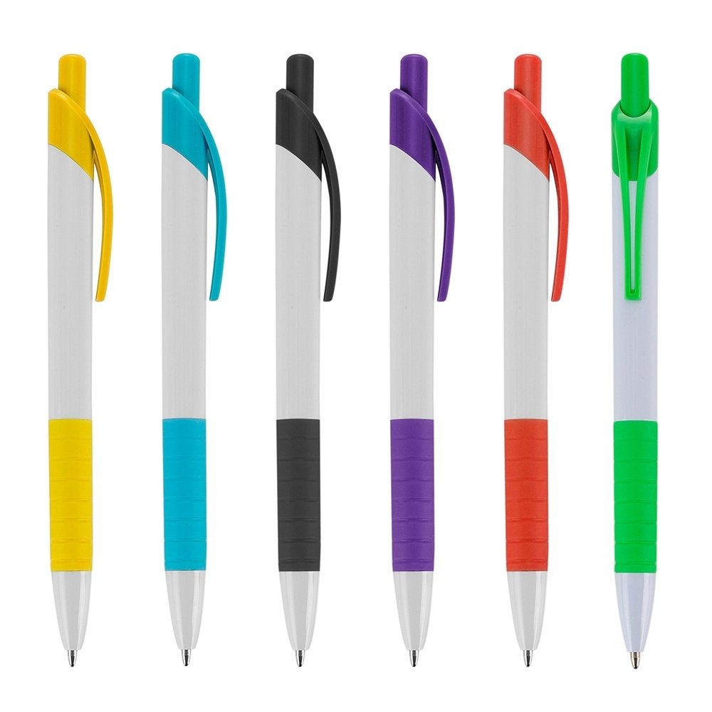 Caneta Plástica Branca: Caneta plástica branca com detalhes coloridos. Clip plástico possui detalhe vazado e parte inferior possui detalhe emborrachado com relevo. Aciona por clique.