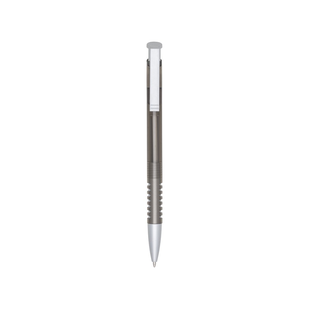Caneta plástica prata: Com detalhes coloridos translúcidos. Clip plástico prata e parte inferior com sete linhas prata. Aciona por clique.