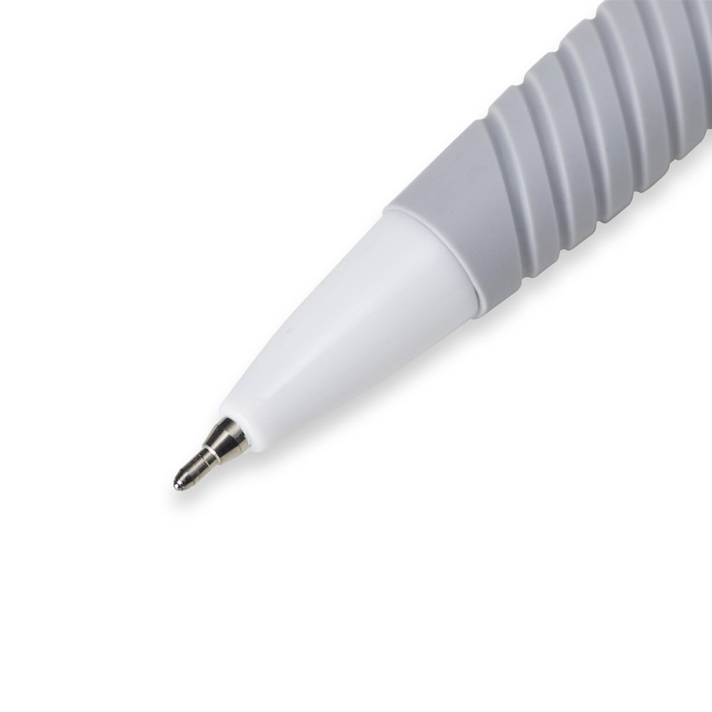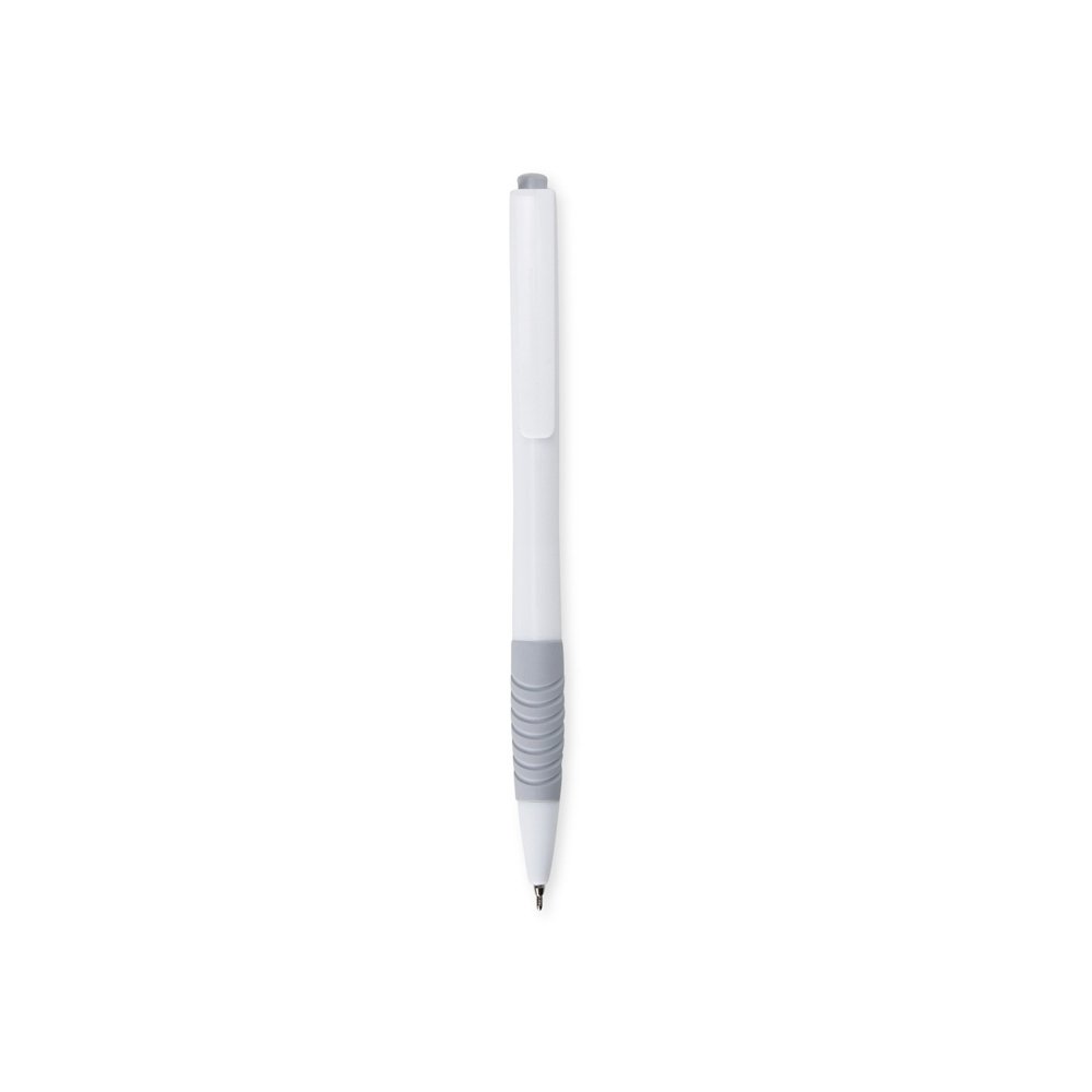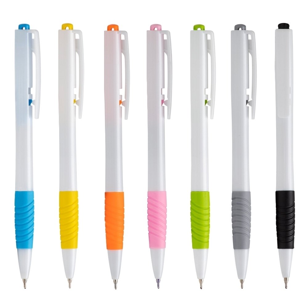Descrição: Caneta plástica com detalhe emborrachado e acionamento por clique, carga esferográfica azul 0.8mm.